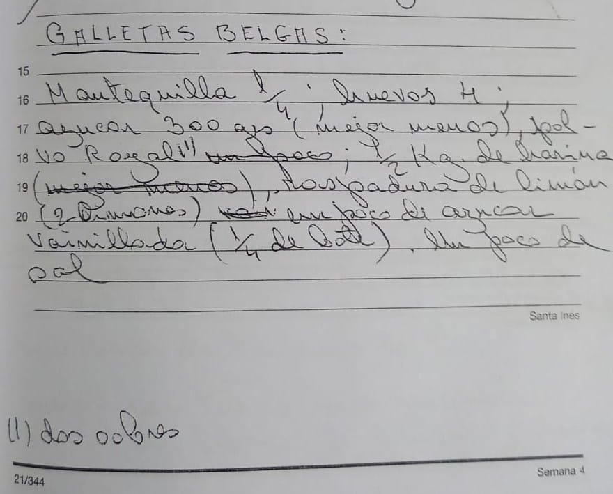 Vale, teníamos el molde, pero había que recuperar la receta. Mi madre aún se acordaba y la escribió en un recetario que ella misma encuadernó: