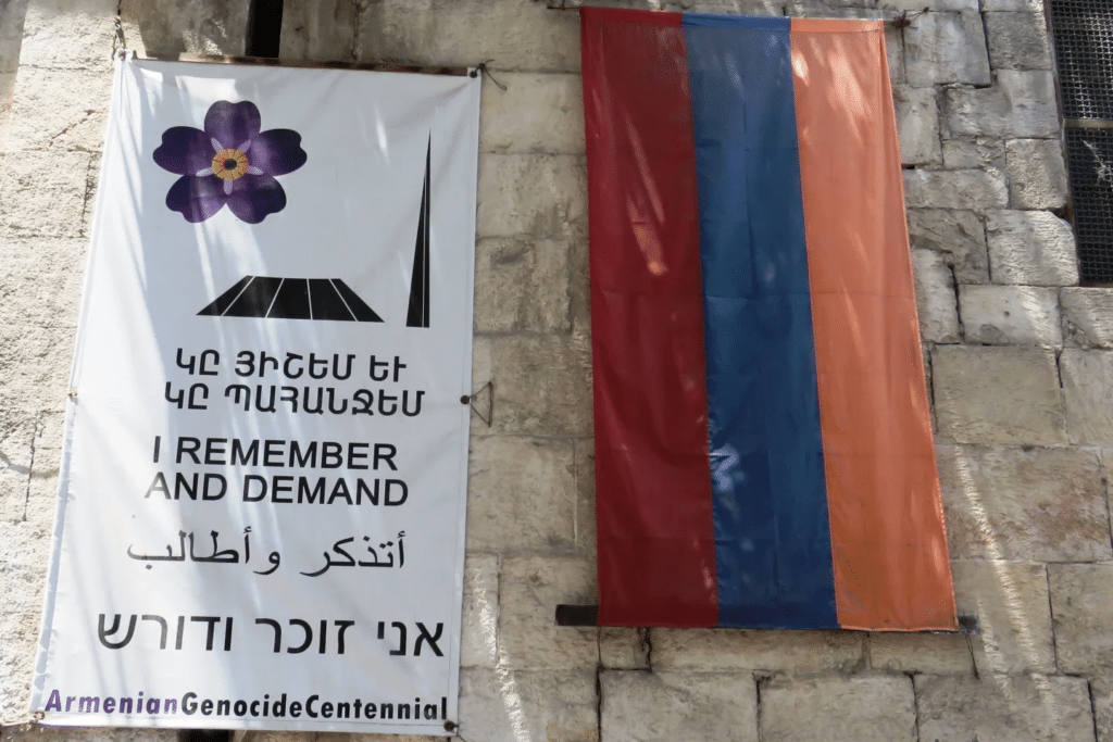 Bandera armenia y cartel recordatorio del genocidio en la ciudad vieja de Jerusalén.