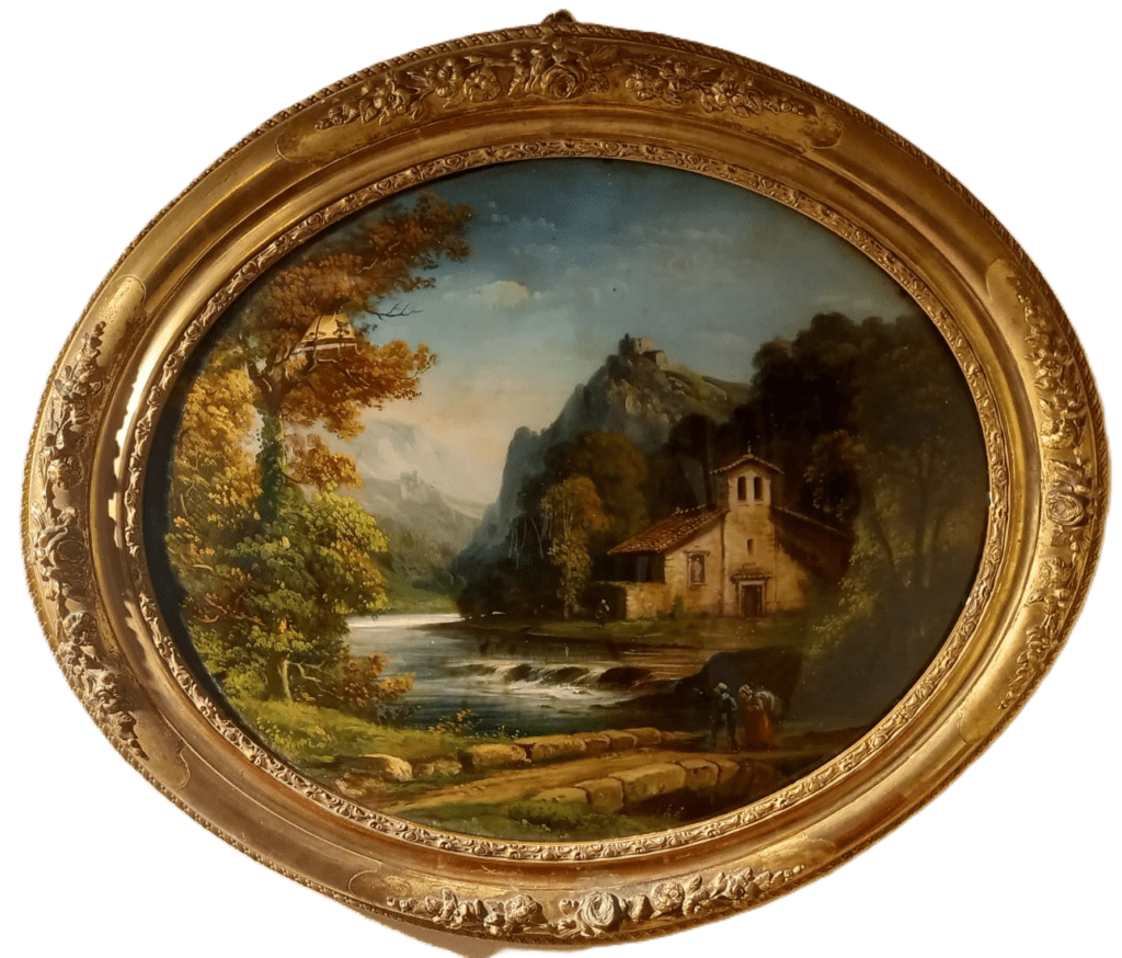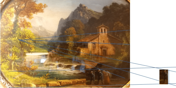 Está pintado con la técnica de «vidrio invertido» . Se pinta directamente sobre el vidrio y al revés que un óleo normal, es decir, se hacen primero los detalles y reflejos y al final de todo, el fondo. No puedes hacer correcciones y se pinta delante de un espejo. Exige mucha precisión y planificación de la obra, un cuadro así puede requerir cientos de horas de trabajo. Tiene la ventaja de conseguir más brillantez de los colores y mejor duración que sobre un lienzo de tela. Lamentablemente no está firmado, si no, valdría una pasta.