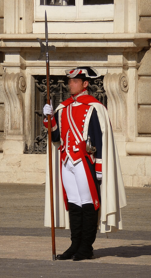 Este es el uniforme de alabarderos, frente al palacio de Oriente en Madrid.