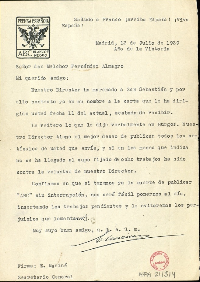 Prensa Española en aquel momento era un periódico republicano conservador. La nota está firmada por Enrique Mariné, secretario general de Prensa Española. Podéis observar el cambio de estilo en esta carta de cinco años después, dirigida a Melchor Fernández Almagro, entonces propagandista del nuevo régimen.
