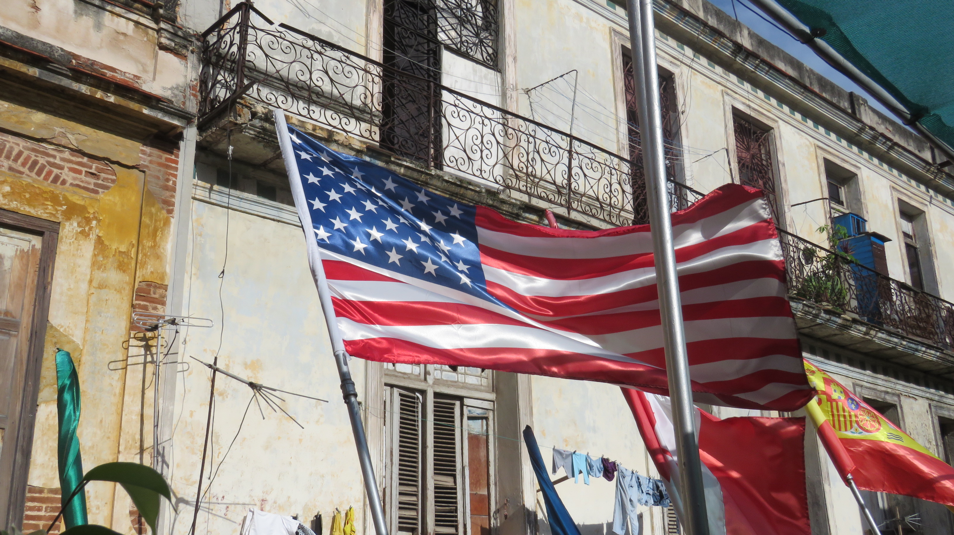 Celebración de la independencia con banderas en los balcones.
